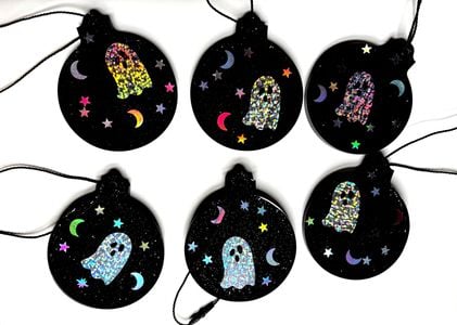 0 savesAdd a touch of spooky elegance to your holiday décor with this set of six glittery black ghost ornaments. Each ghost is adorned with shimmering stars and moons, perfect for those who love a goth or witchy aesthetic during the festive season. These unique ornaments bring a mystical charm to your tree, combining the allure of glitter and the whimsy of ghostly shapes.