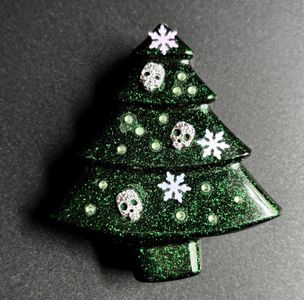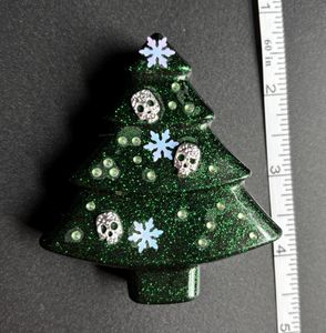 1 savesCelebrate the season with a unique twist by adding this pair of green trees decoration featuring skulls, perfect for both holiday and Halloween vibes. These small, sparkly accents bring a touch of goth charm and witchy allure to your festive decor. Handcrafted with care, they blend traditional holiday spirit with a playful edge that stands out in any setting.